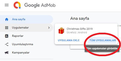1. Google Admob sayfasında oturum açın. 2. Uygulamalar sekmesinden Tüm Uygulamalar'ı seçin.