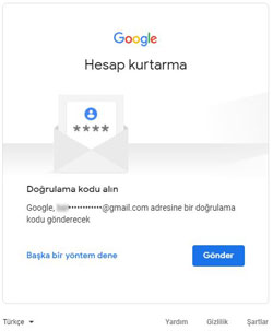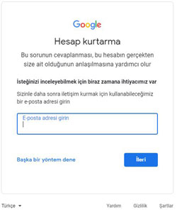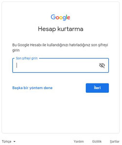 Google Hesabım, Gmail giriş, herhangi bir Google hizmeti giriş sayfası ya da Google hesabı kurtarma sayfasını açarak kurtarmak istediğiniz gmail adresinizi yazın ve e posta şifremi unuttum tuşuna basın. Gelen ekranda bu gmail hesabımızda önceden kullandığınızdan emin olduğunuz bir şifreyi yazın. Eğer bu şifreyi daha önce kullandıysanız hesabı kurtarma anlamında değerli bir adım atmış olacaksınız. Sonraki gelen ekranlardaki soruları da uygun yanıtlayabilirseniz yeni bir şifre tanımlamanıza olanak sağlanacaktır. Sonraki sorular sizin hesap oluştururken girdiğiniz bilgilere bağlı olarak değişir.