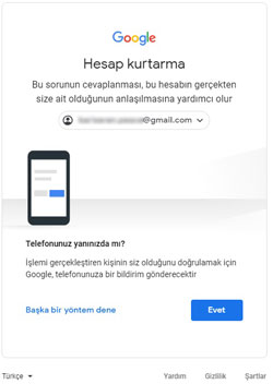 Önceden kullandığınız bir Google hesap şifresi yoksa veya hatırlamıyorsanız "Başka Bir Yöntem Dene" tuşuna basarak ilerlediğinizde hesabınıza tanımladığınız telefonunuz ile hesaba girişiniz mümkün olabilir. Telefonum Yanımda seçeneğini seçtiğinizde telefonunuza gelen bildirim ile hesap girişinizi onaylayabilir ve hesabınızı kurtarabilirsiniz. Mail şifremi unuttum diyenler için en hızlı yöntem budur. Gerekli şartlar ise; hesabınıza telefon numarası tanımlamış olmak, bu numarayı bir akıllı telefon ile kullanıyor olmak ve hesaba bu telefon ile önceden giriş yapmış olmaktır.