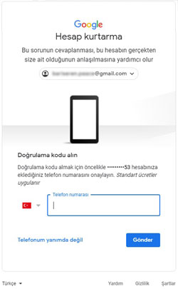 Google şifremi unuttum ve gmail hesabıma tanımlı telefon numaram haricinde elimde hiçbir şey yok diyorsanız bu adımda sorununuz çözülecek! Önceki adımları "Başka Bir Yöntem Dene" tuşuna basarak geçtiğinizde telefon numaranızı girmeniz için bir ekran belirecek. Numaranızı girin ve ilerleyin. Tamam'a bastığınızda telefonunuza bir SMS gelecek (eğer ayarlarda SMS yerine "arama"yı seçtiyseniz bir arama gelecek). Gelen kodu girerek e posta giriş yapmanız mümkün.