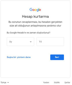 Bu adımda gmail şifre kurtarma için Google hesabınızı oluşturduğunuz tarihi ay ve yıl olarak girmeniz gerekecek. Bunu yapmak bir çoğumuz için oldukça zor. Özellikle de uzun zamandır kullandığımız Google hesapları için.. Doğru sonucu elde edemezseniz elinizde iki seçenek kalmış oluyor: Google'dan yardım talep etmek ve Best Veri Kurtarma Merkezi'ne başvurmak!