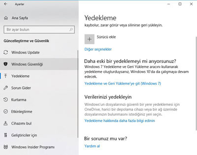 Diğer bir seçeneğimiz bilgisayar yedeklerine dönülmesi olabilir. Otomatik olarak periyodik sistem yedekleme özelliği açıksa ya da fotoğrafları silmeden önce kendiniz bir sistem yedeği aldıysanız bu yedekten geri yükleme yoluyla silinen fotoğrafları geri getirme programsız olarak mümkün olabilir. Ancak yedek alma tarihinden sonra yaptığınız işletim sistemi güncellemeleri ve kişisel olarak yaptığınız diğer güncellemeler riske girmiş olacaktır. Bunu yapmadan önce sistemin son halinin yedeğini bir harici harddiske almanızda fayda var. Windows 10 için sistem yedeği alma ve yedeğe geri döndürme işlemlerini Windows Başlat -> Ayarlar -> Güncelleştirme ve Güvenlik -> Yedekleme adımlarını takip ederek yapabilirsiniz.